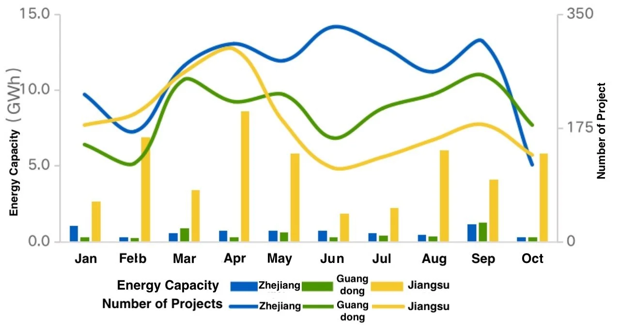 Figure 4 : Monthly Trend of Newly Filed Energy Storage Projects in Zhejiang, Guangdong, and Jiangsu (January–October 2025)