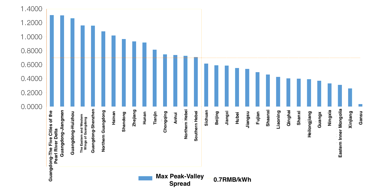 Based on the maximum peak–valley electricity price spread, 15 provinces and municipalities recorded spreads above 0.70 RMB/kWh, and 7 regions exceeded 1.0 RMB/kWh. Guangdong had the largest peak–valley price spread nationwide. In parts of the Greater Bay Area—including the five core cities of the Pearl River Delta, as well as Jiangmen and Huizhou—the maximum spread remained above 1.0 RMB/kWh, mainly due to the continued implementation of critical-peak pricing in the province. In October, many regions discontinued the critical-peak and deep-valley tariff mechanisms that were implemented during the summer peak period. Only five regions—Guangdong, Shandong, North Hebei (Jibei), South Hebei, and Hubei—continued to apply critical-peak pricing, while Shandong, Zhejiang, and Jiangxi maintained deep-valley tariffs. Considering both the maximum peak–valley price spread and the high achievable charge–discharge cycling frequency of user-side storage systems (which can exceed 600 cycles per year), the arbitrage potential in Guangdong remains substantial. Therefore, Guangdong is likely to remain one of the most important and active markets for user-side energy storage in the foreseeable future.