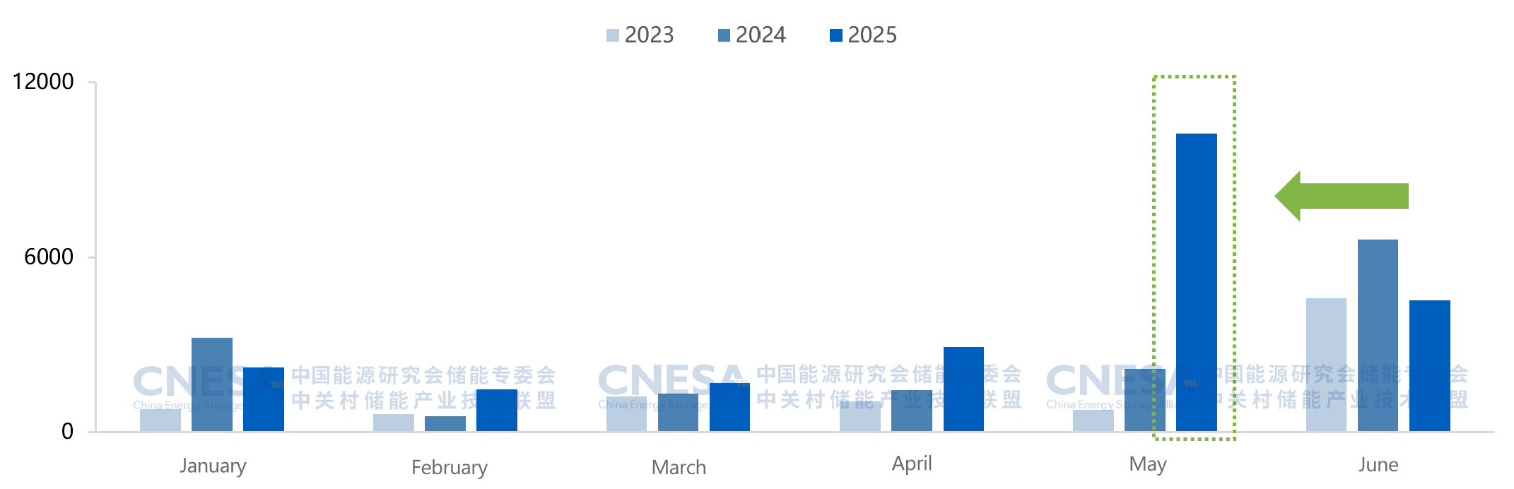 Figure 3: Comparison of Monthly New Installations of New Energy Storage in China (2023-2025.H1, Unit: MW)