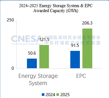 In 2025, the winning bid volume for energy storage systems (excluding centralized and framework procurement) reached 121.5GWh, up 140.1% year on year. Meanwhile, EPC projects recorded a winning bid volume of 206.3GWh, representing a 125.5% increase.
