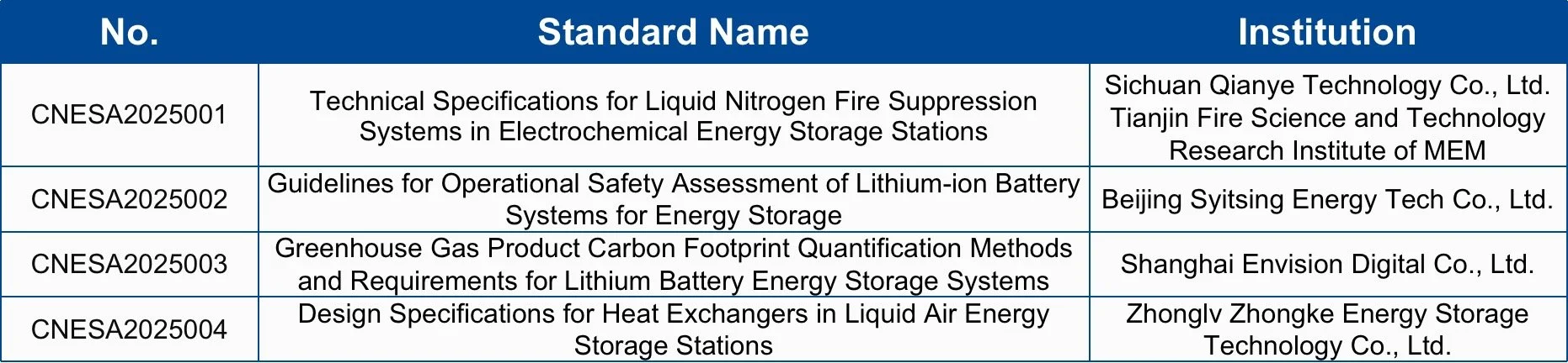 In 2025, CNESA contributed to the establishment and release of seven new standards, covering liquid nitrogen fire suppression, lithium-ion battery safety, carbon footprint quantification, and sodium-ion systems.